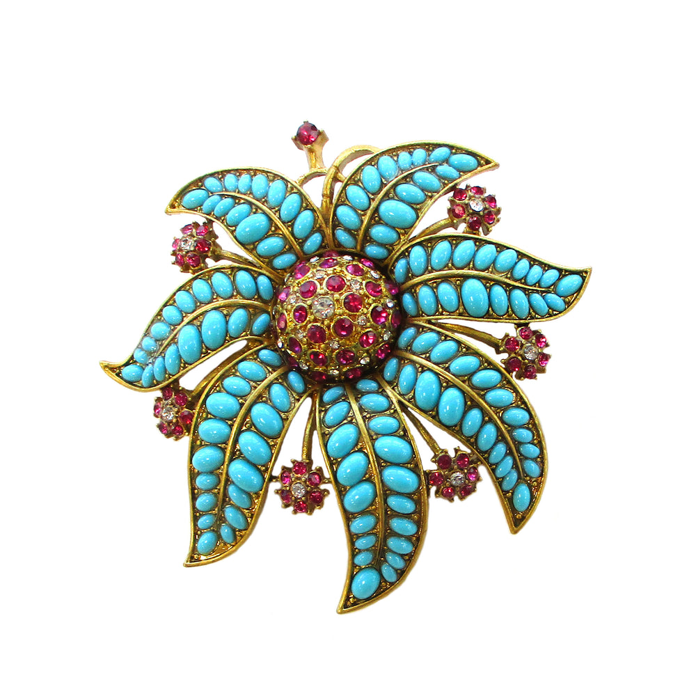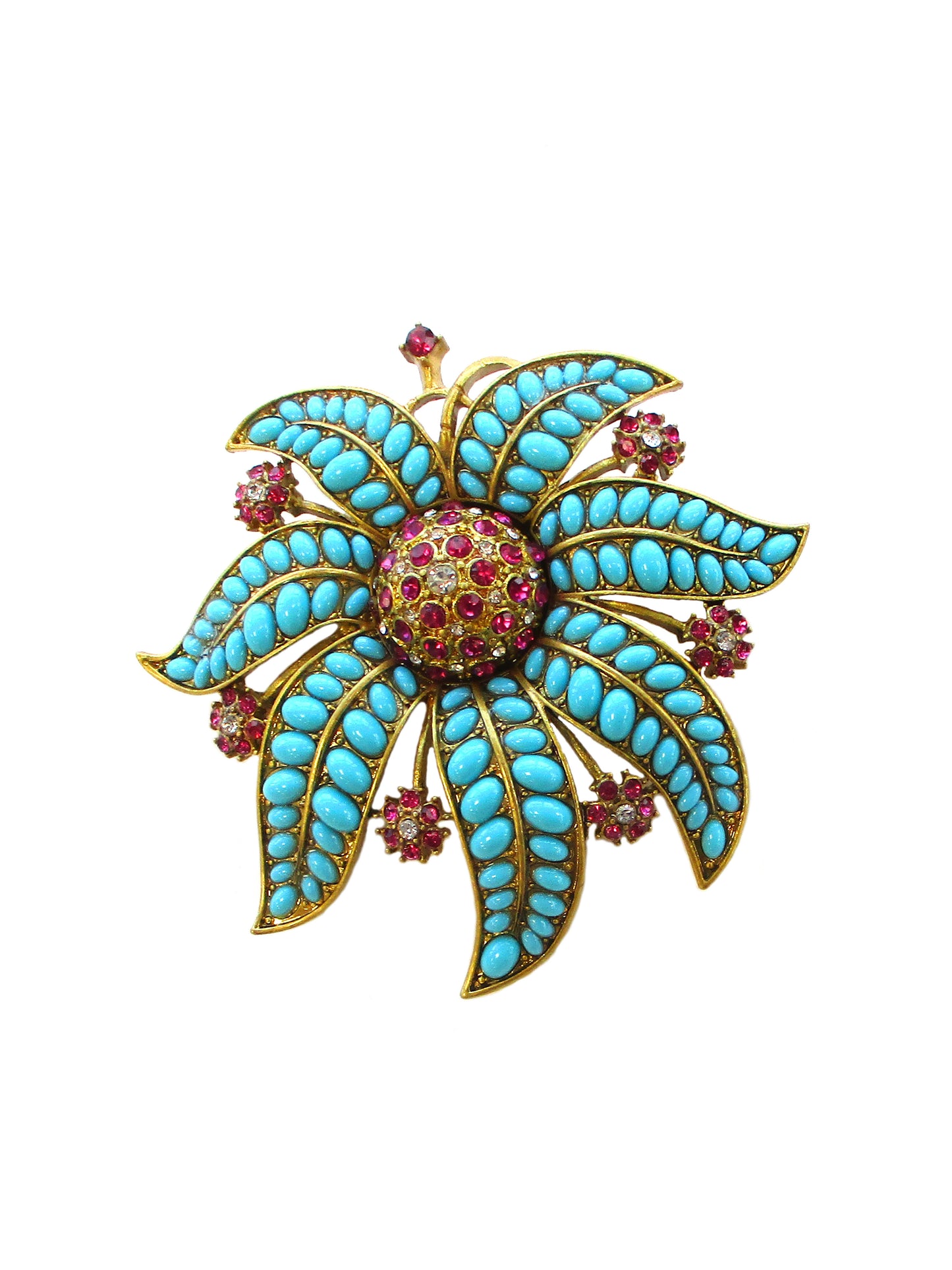 Spilla con petali decorati da cabochon in vetro turchese e centrale strass rubino Aida
